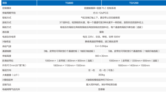 TG800-TG1200 是 FPC 全自动炉后收板机设备,专为炉后收板环节设计,具备多通道收板能力,可有效提高炉后处理效率。设备采用气缸控制 Z 轴上下,真空带止回功能吸取,确保收板过程稳定可靠。